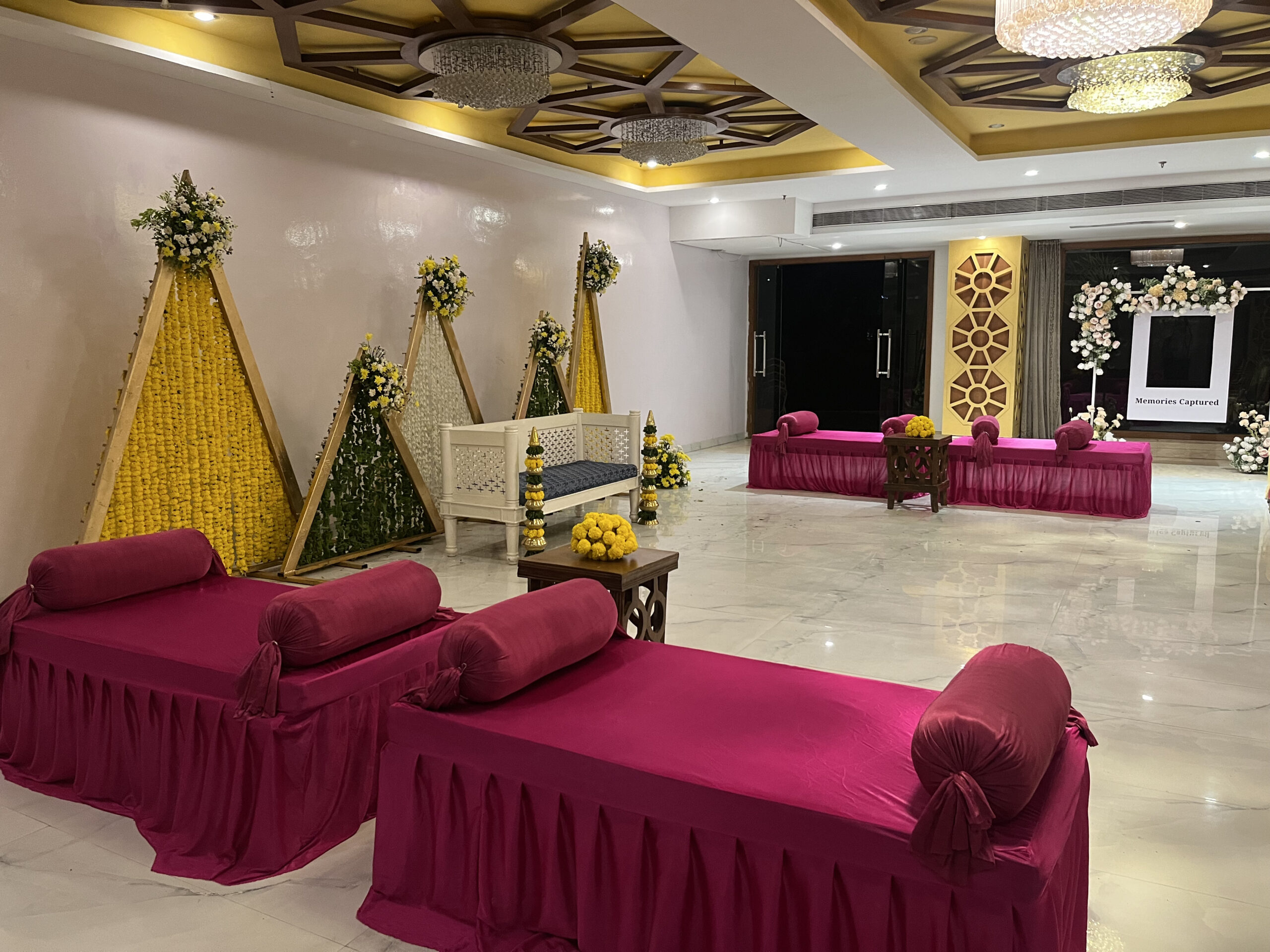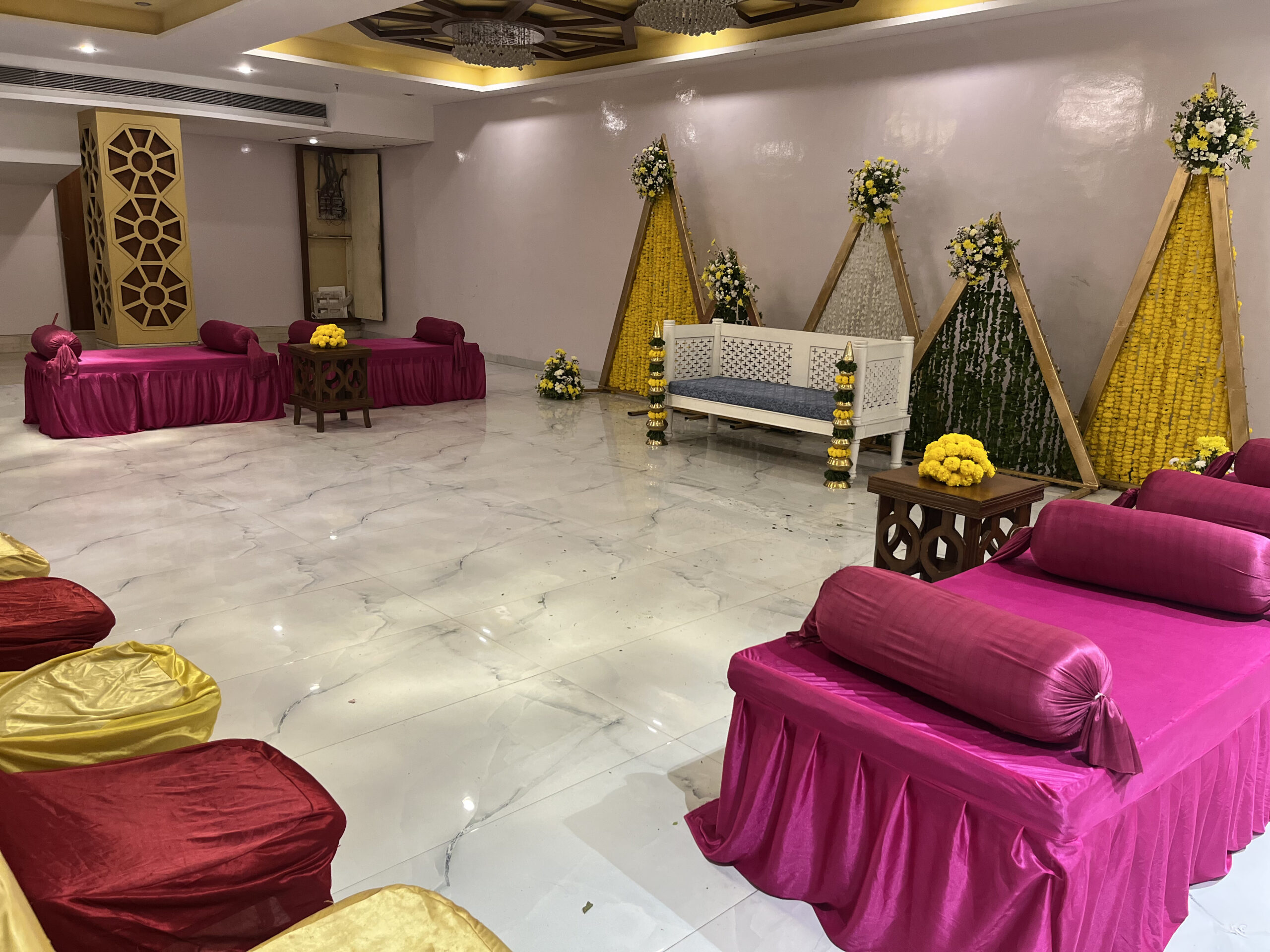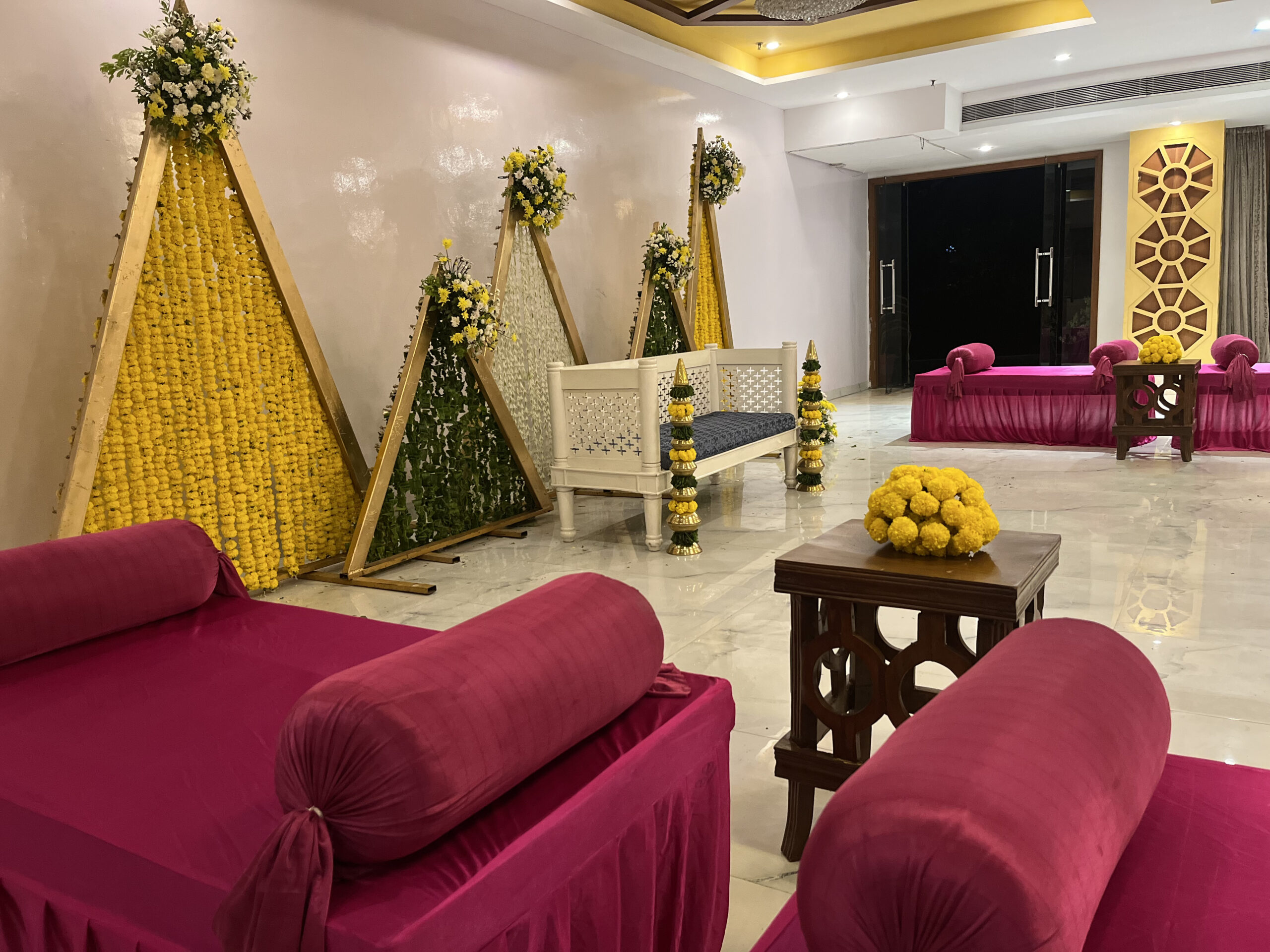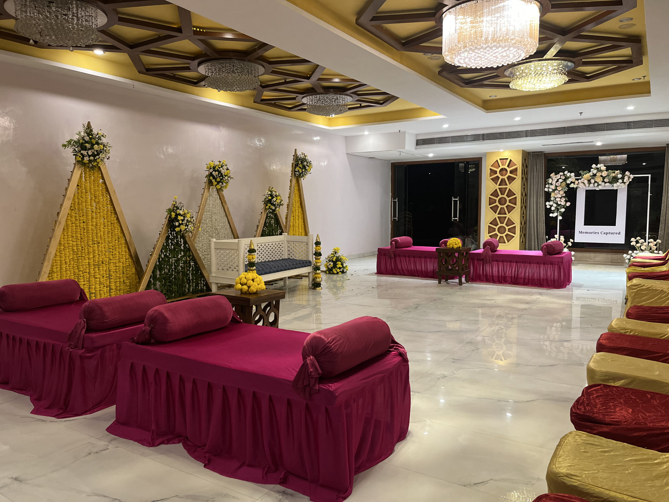 Colourful drapes, ethnic elements, floral accents and thematic seating brought this Mehndi to life. Our team executed everything from décor to guest coordination.