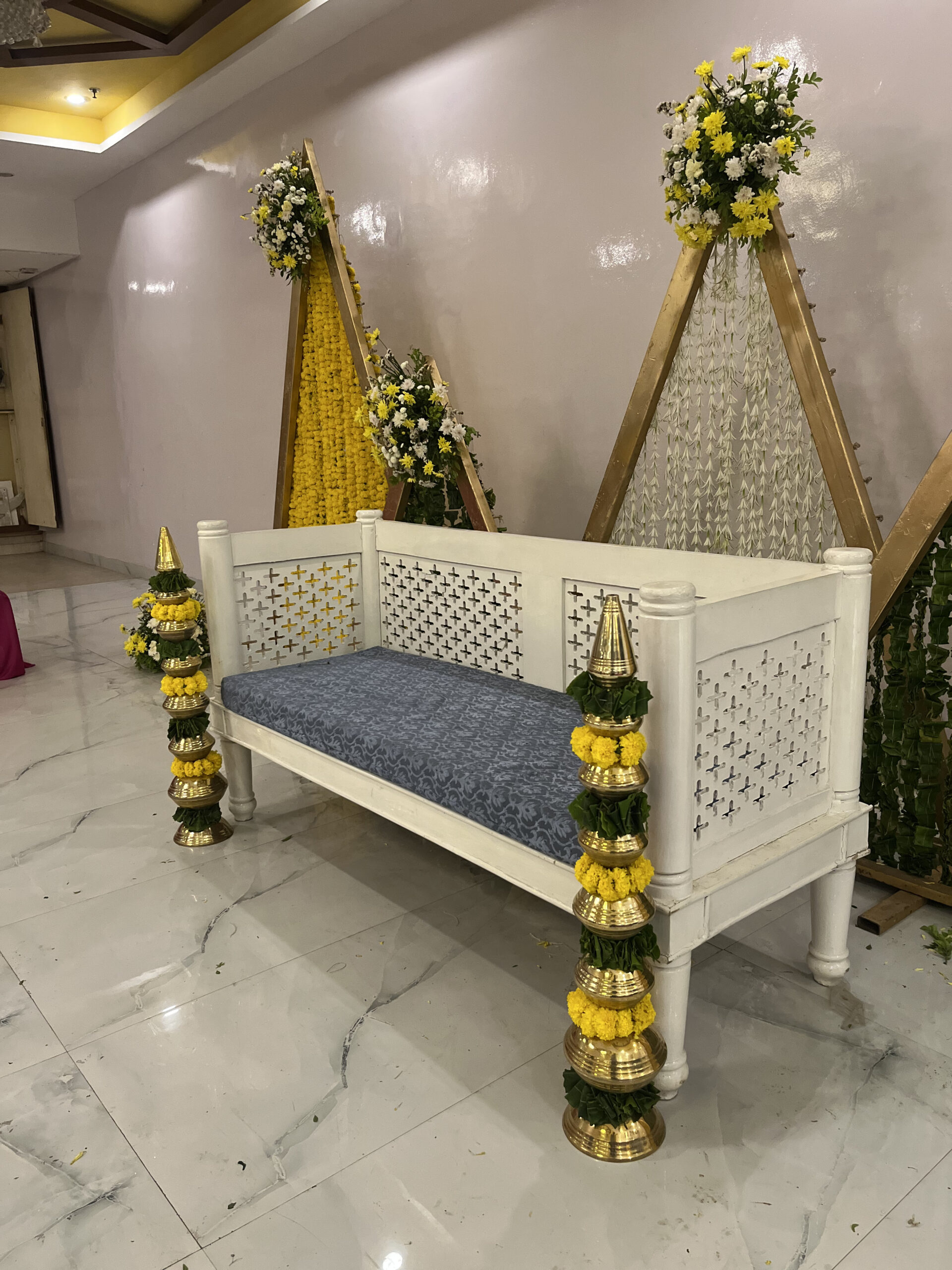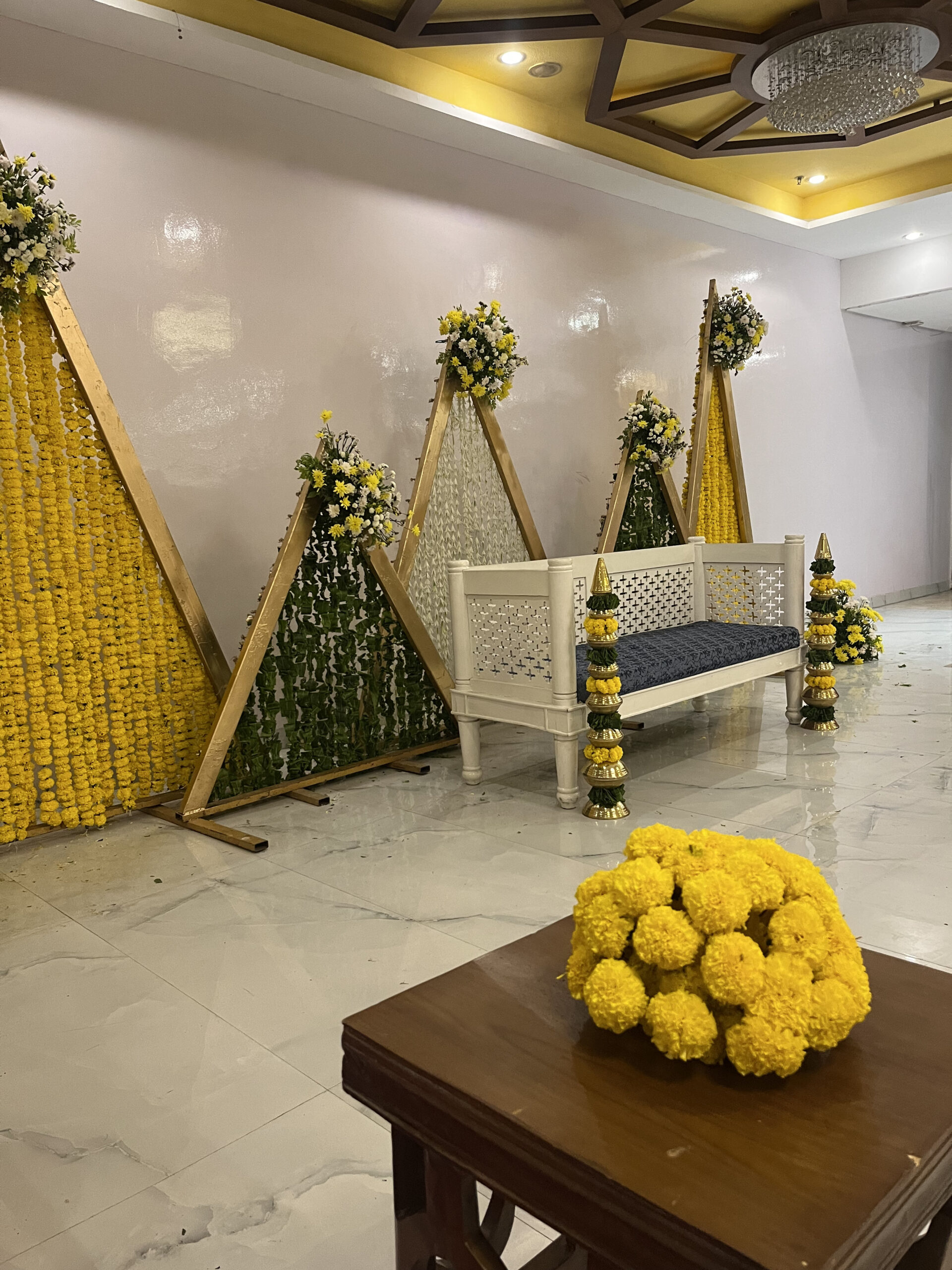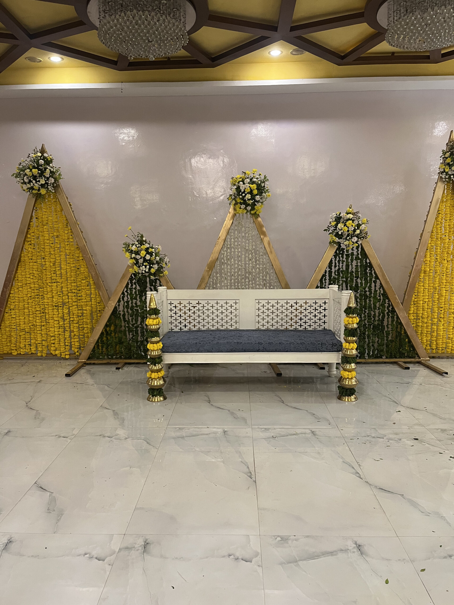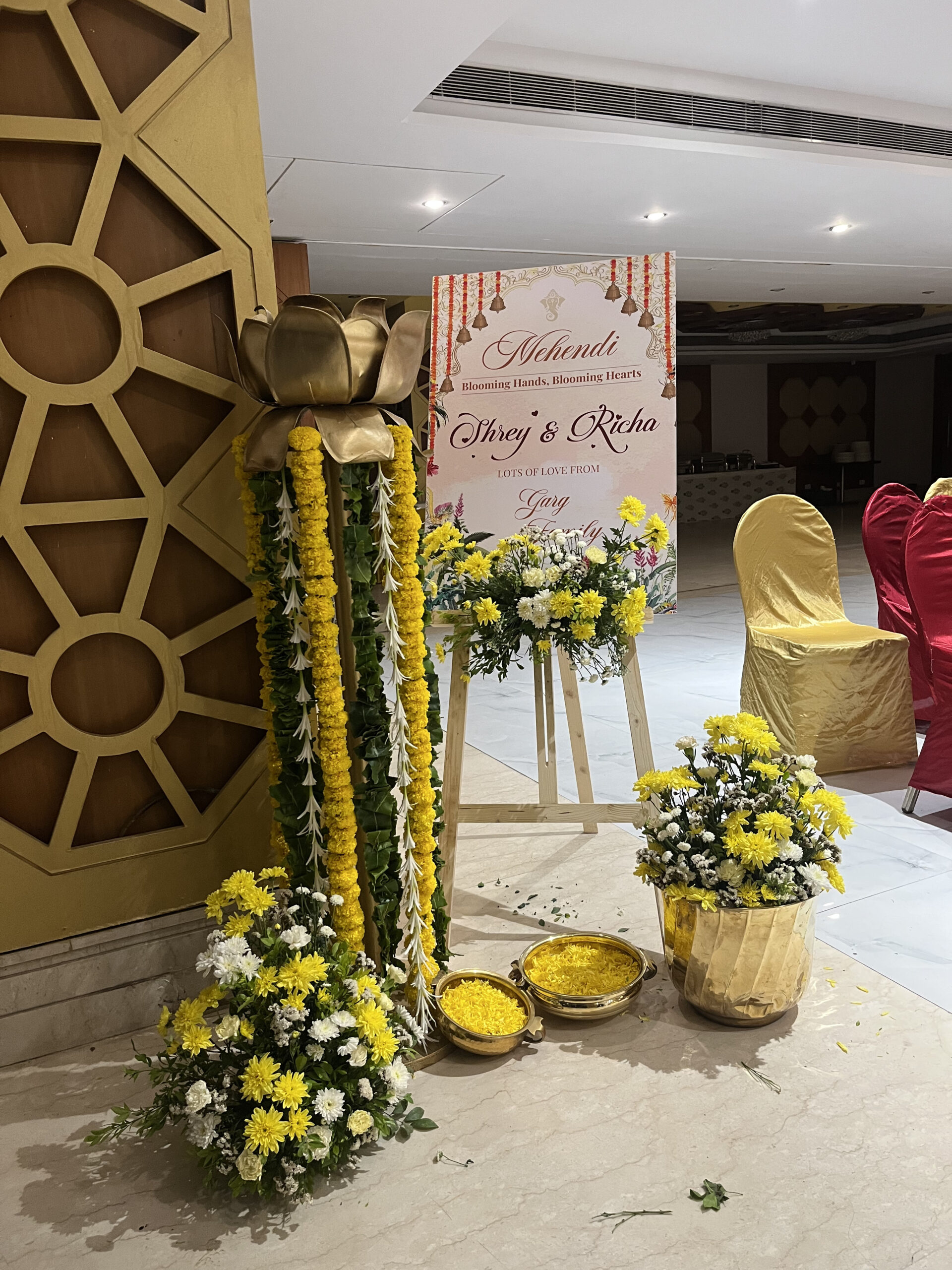 Colourful drapes, ethnic elements, floral accents and thematic seating brought this Mehndi to life. Our team executed everything from décor to guest coordination.