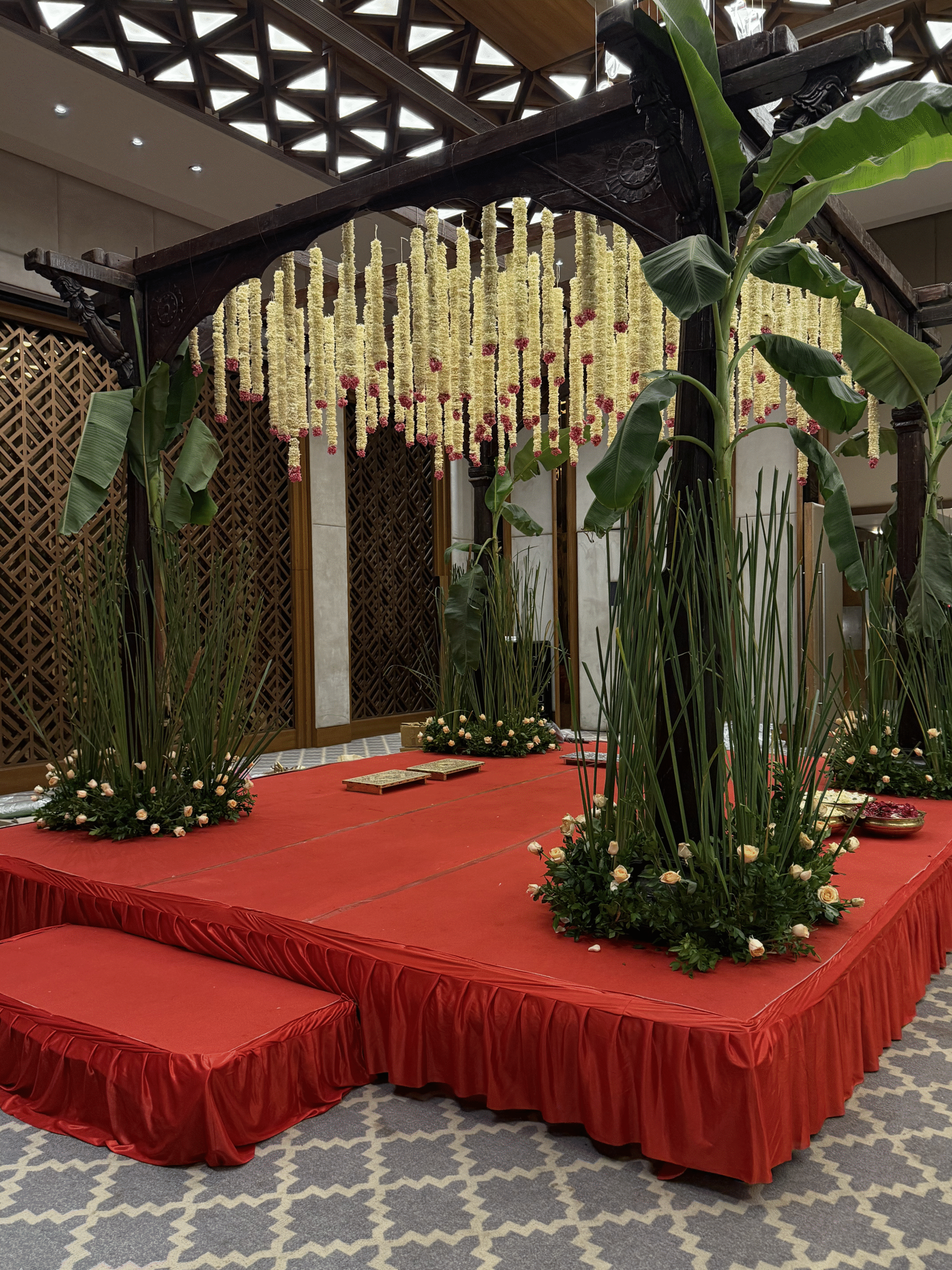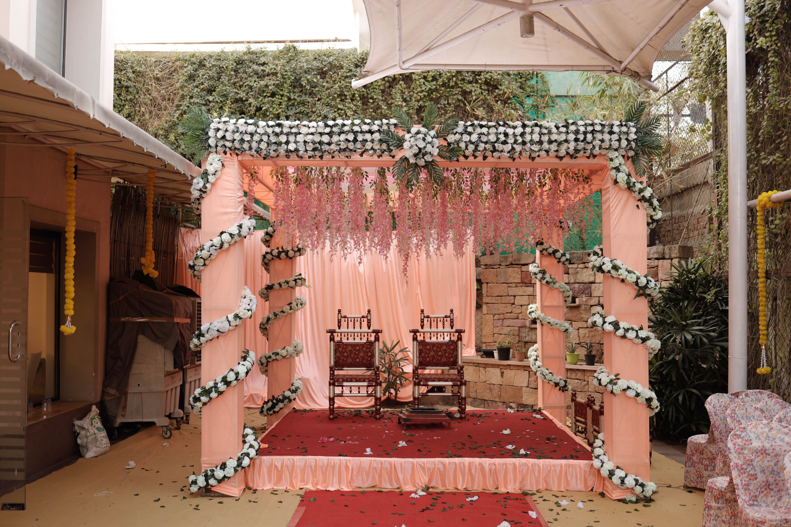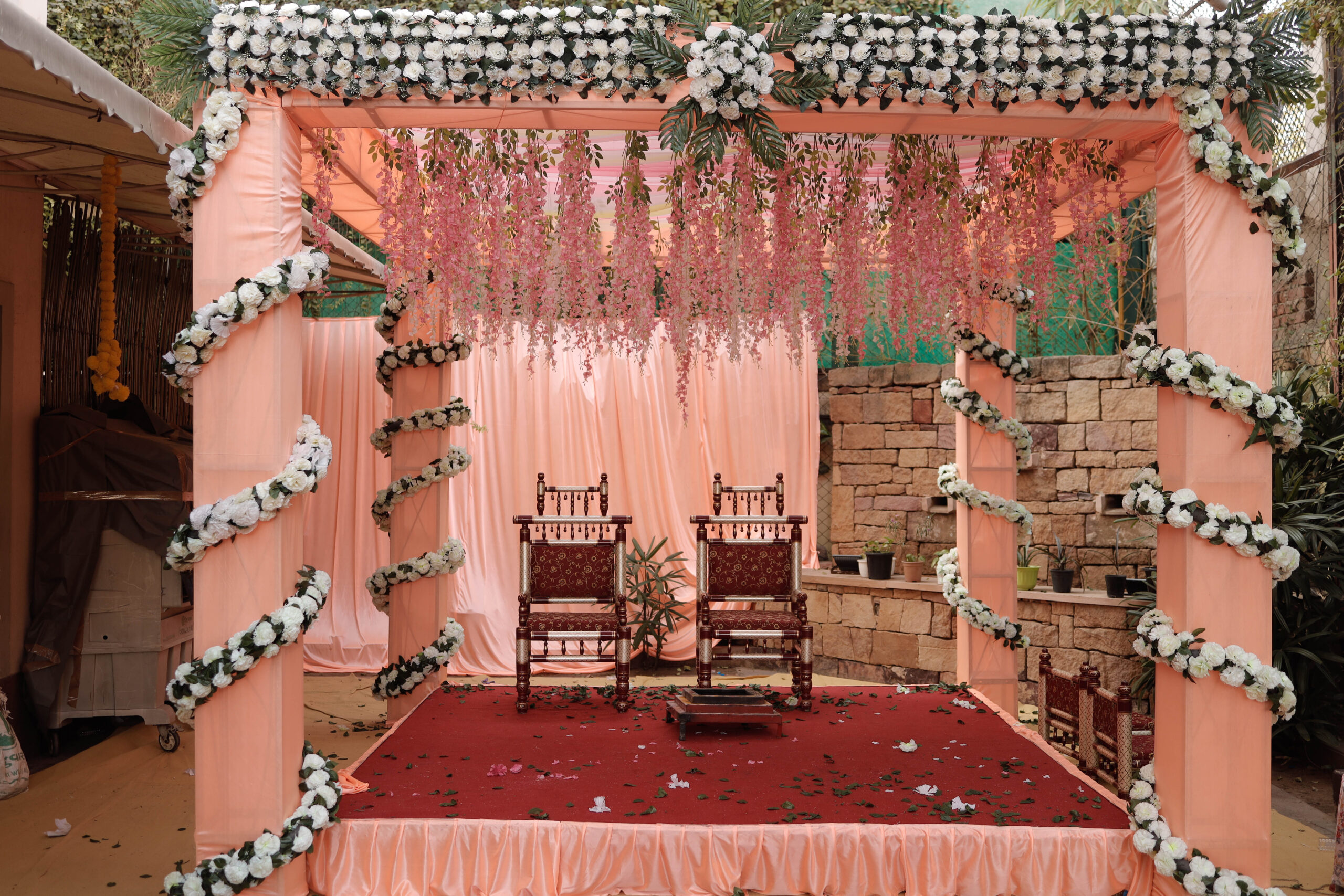 A soft pastel-themed wedding décor with fresh florals, structured stage design, guest flow management, and complete event coordination. Our team handled planning, décor, hospitality, and vendor integration — delivering a seamless wedding experience.